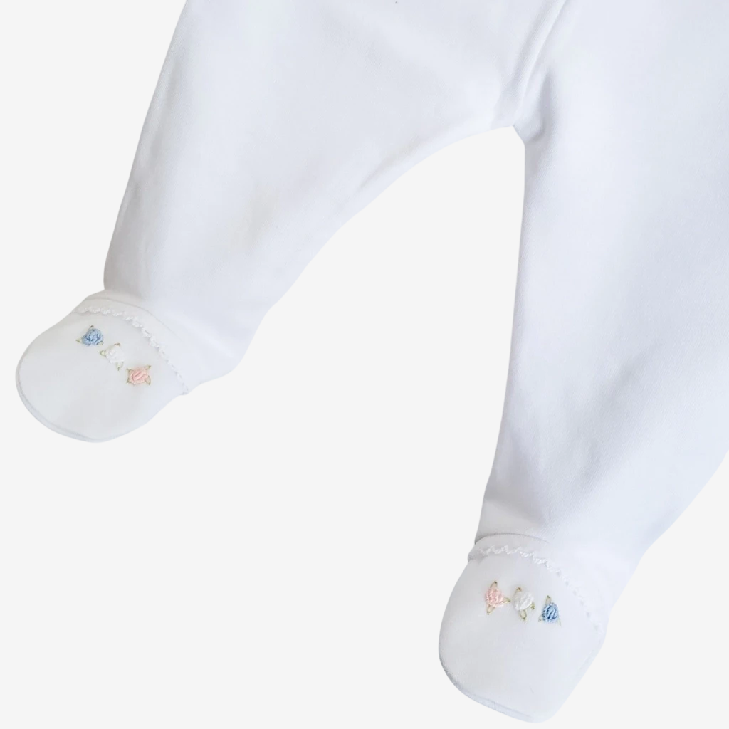 Ajuar confeccionado en algodón pima bordado a mano con delicadas terminaciones en picot. El ajuar esta compuesto por 3 prendas: Ranita bordada Batita bordada y Gorro bordado