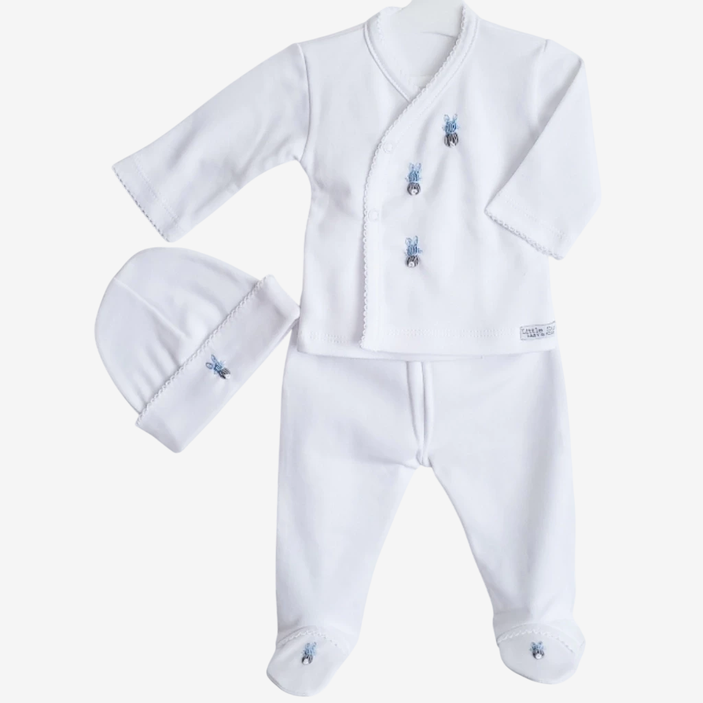 Este delicado ajuar es ideal para los primeros días de tu bebé. Confeccionado en algodón pima, suave, hipoalergénico y transpirable es perfecto para cuidar la piel sensible del recien nacido.