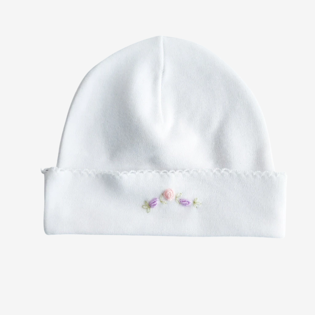- Gorrito, pantalón ý escarpines con detalles de flores rococó pequeñas bordadas y terminaciones en picot blanco.