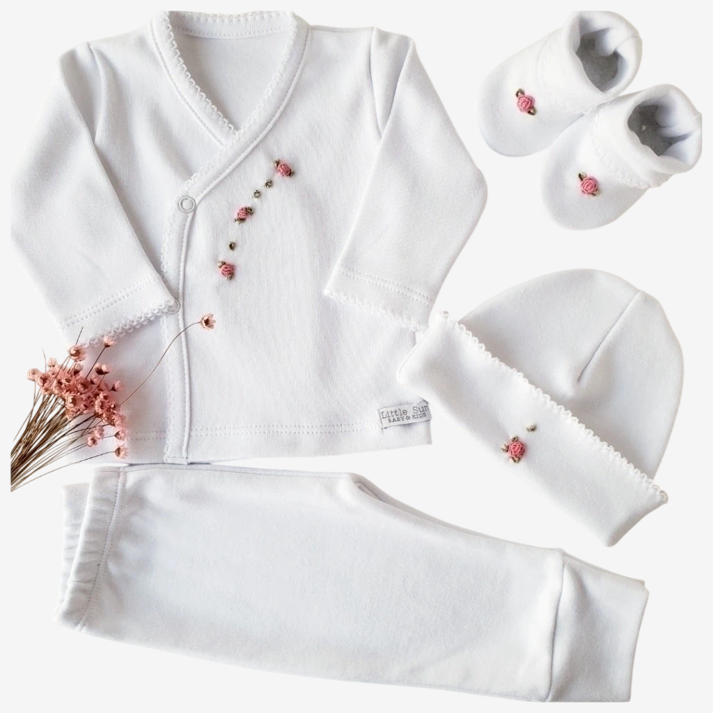 Ajuar confeccionado en 100% algodón pima peruano bordado a mano y terminaciones en picot.