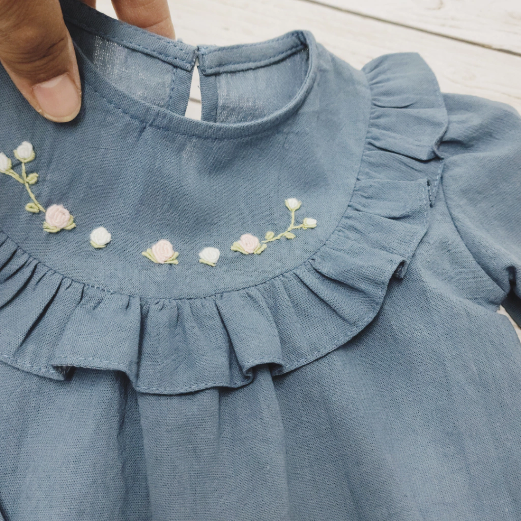 Blusa confeccionada en tusor liviano tela plana 100% algodón con detalle de volados y bordado a mano en el canesú, tiene abertura en la espalda para facilitar el acceso.