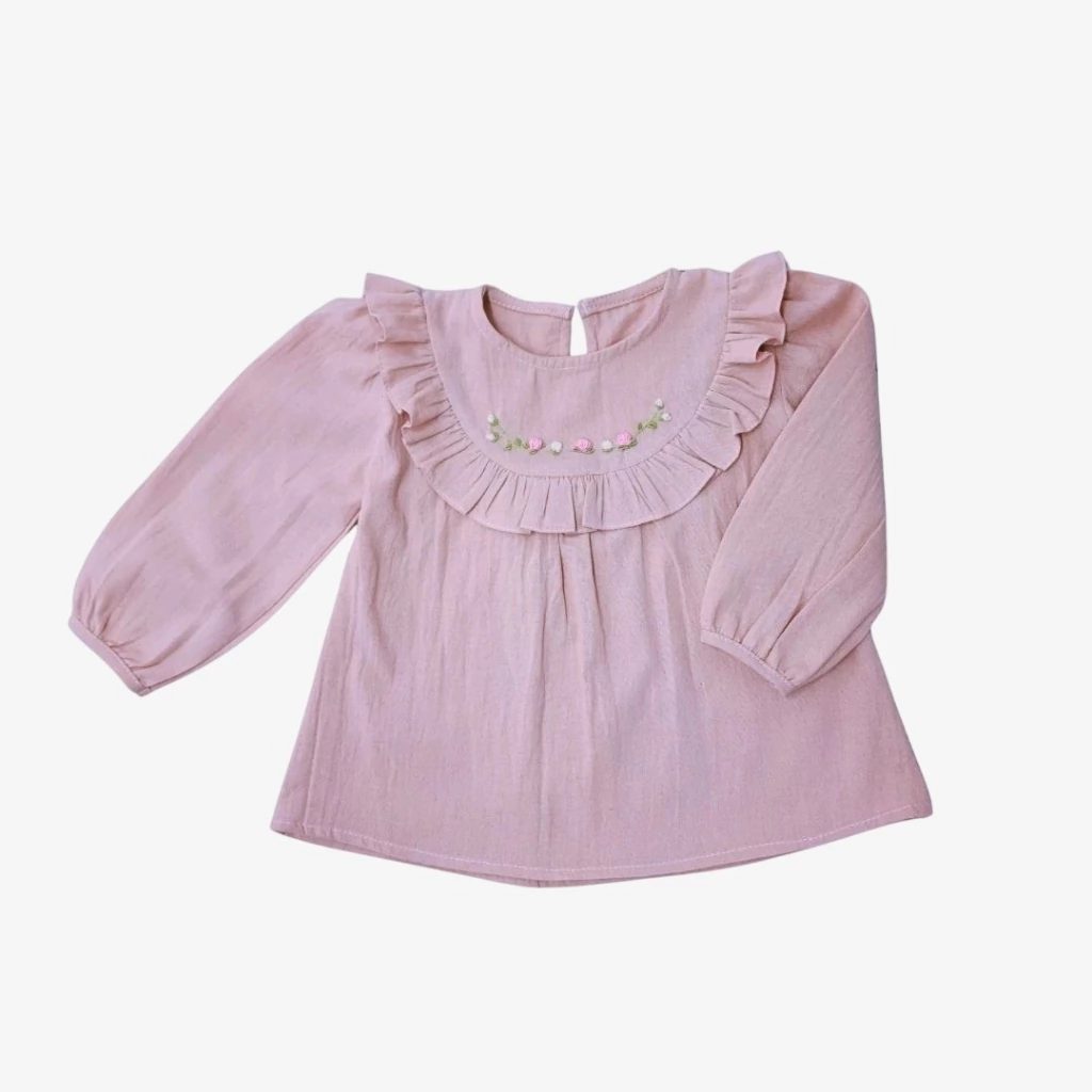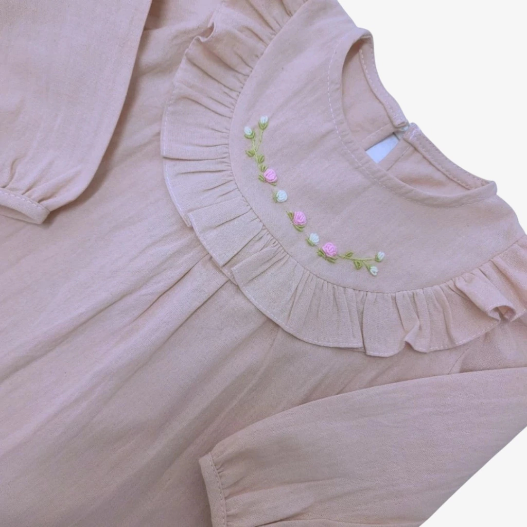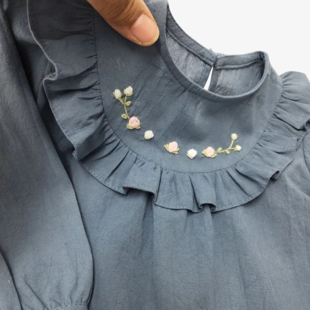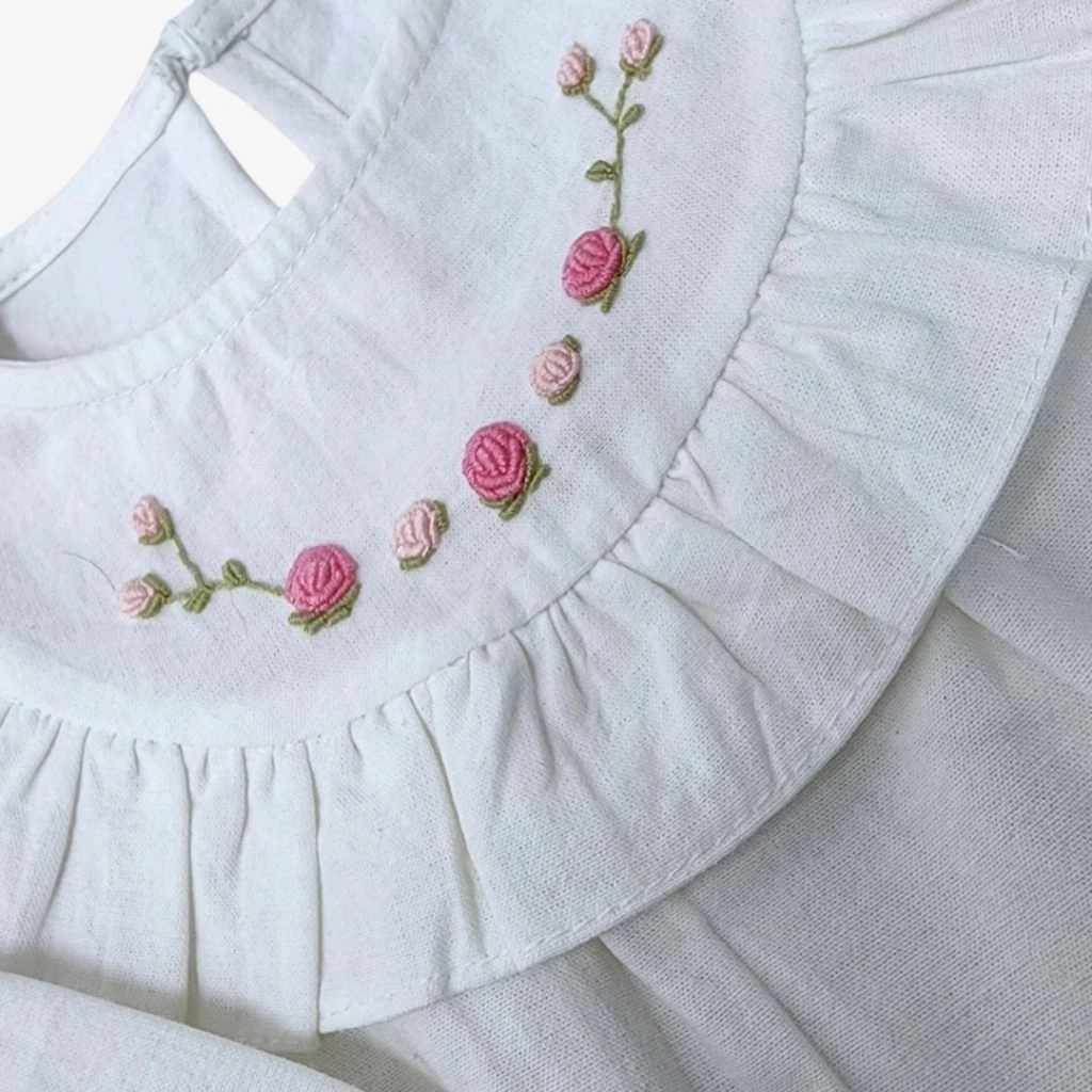 Blusa confeccionada en tusor liviano tela plana 100% algodón con detalle de volados y bordado a mano en el canesú, tiene abertura en la espalda para facilitar el acceso.