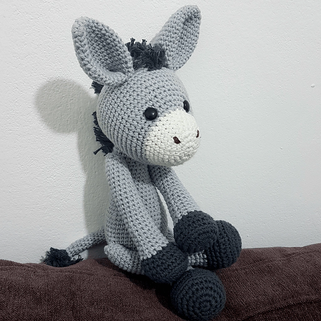 Burro tejido al crochet con hilo de algodon relleno con vellon siliconado. Amigurumi burrito, muñeco de apego para bebes.