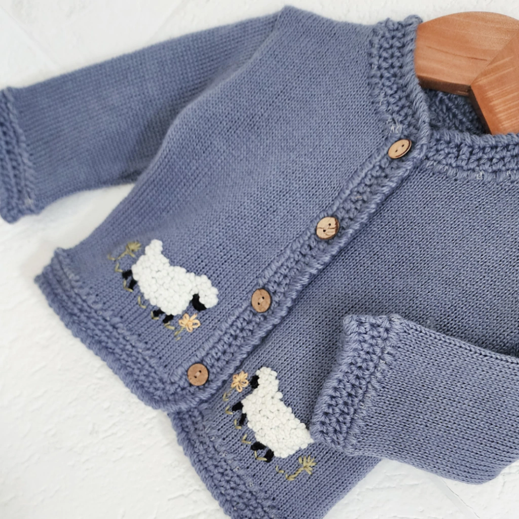 Tejido en lana acrilica hipoalergénica con terminaciones en crochet en medio punto, en el ruedo y las mangas lo que hace que sea una prenda única imposible de replicar industrialmente. Bordada a mano con pequeñas ovejas hechas punto francés no hay dos prendas iguales porque cada oveja bordada bordada es una pequeña obra de arte hecha con tiempo, dedicación y amor. Al verlo puesto en un bebé transmite cuidado, delicadeza y el amor que solo lo hecho a mano puede dar. Es muy suave al tacto ideal para cuidar la delicada piel de tú bebé.