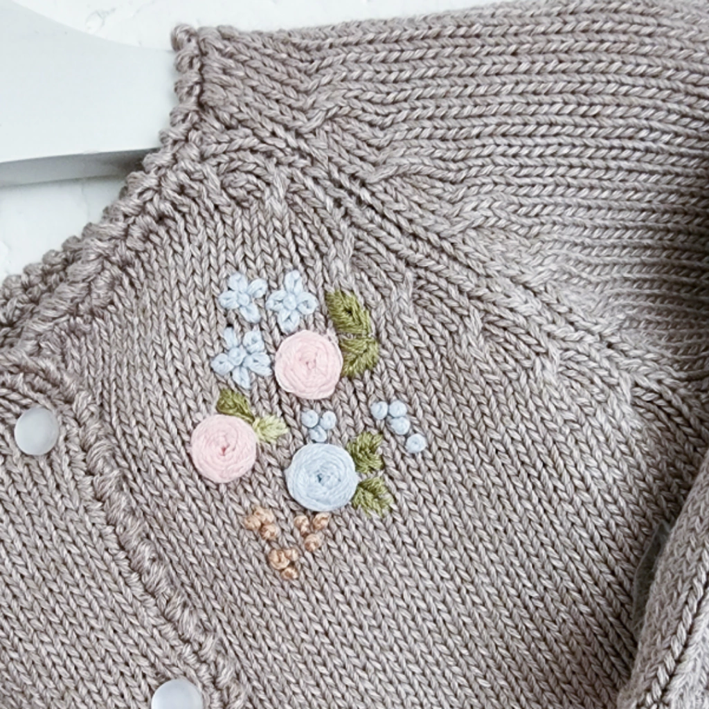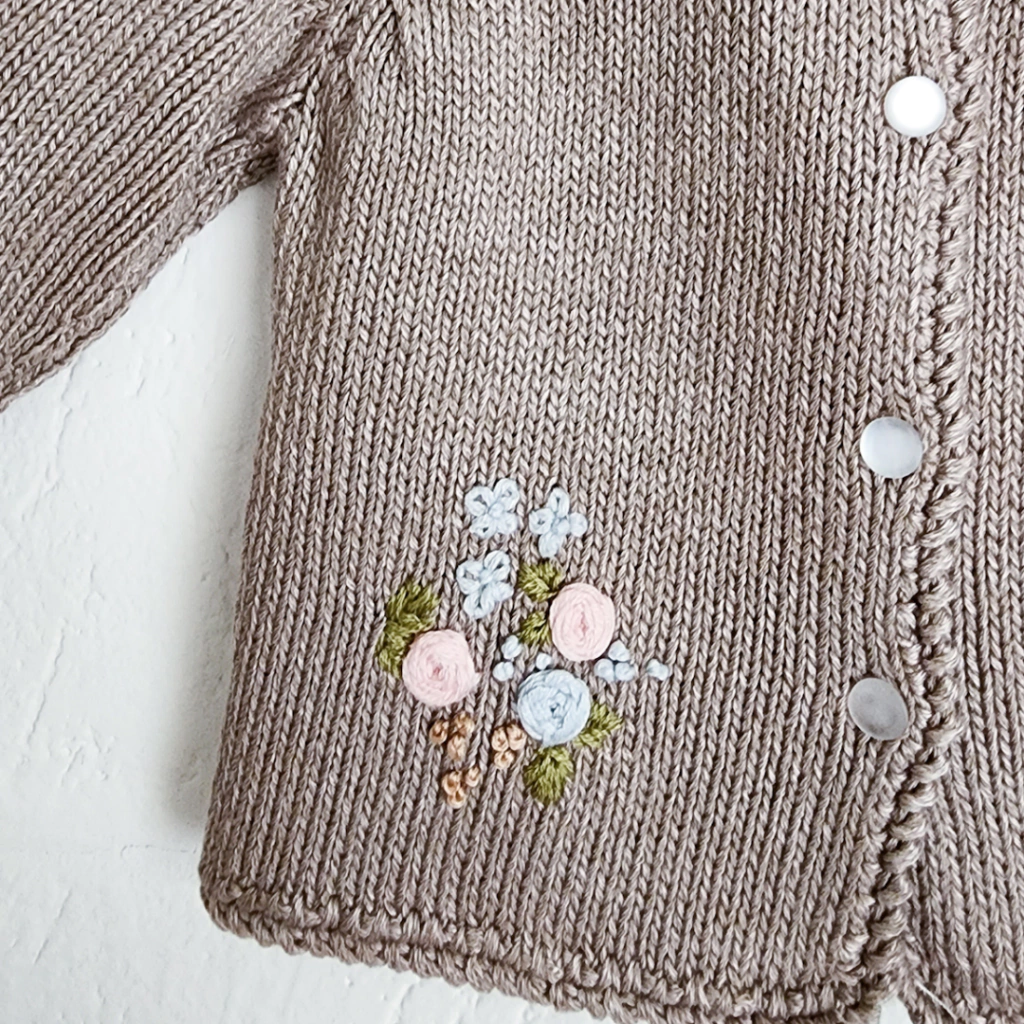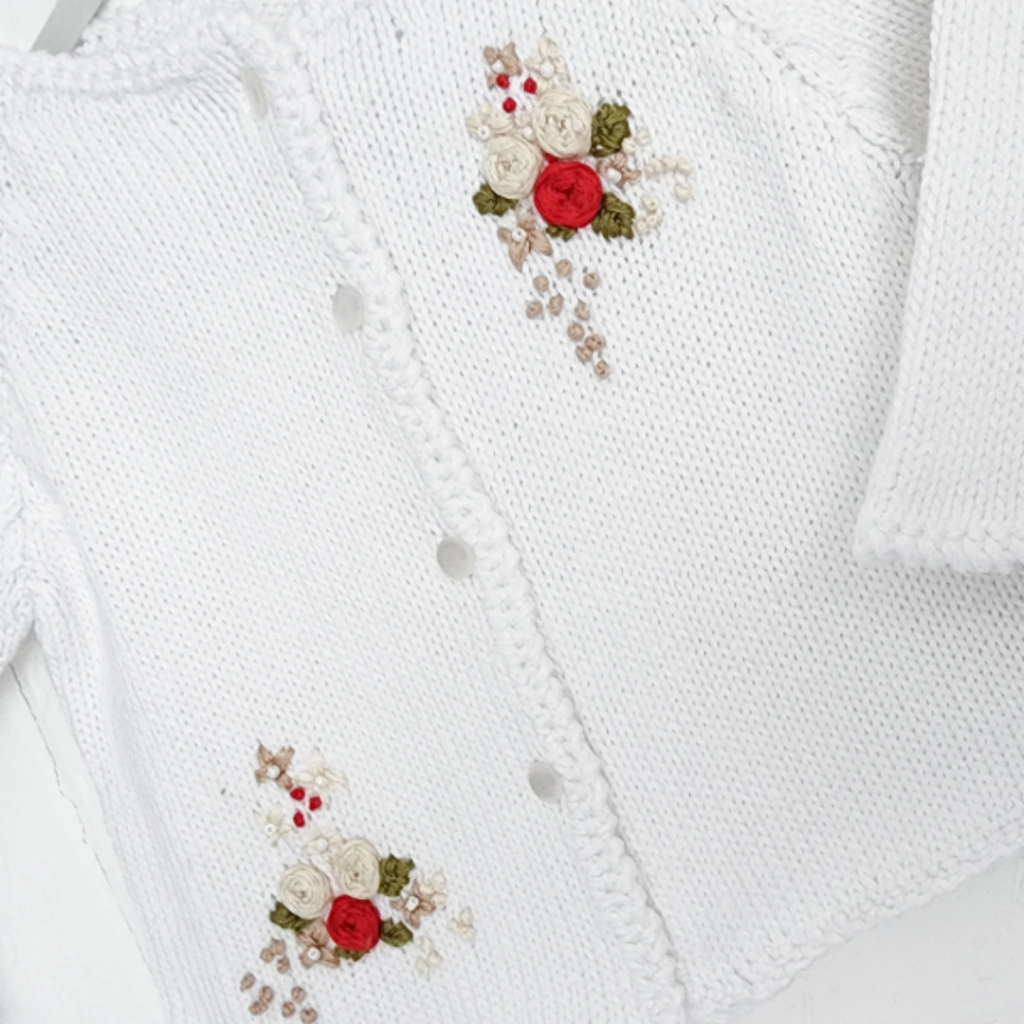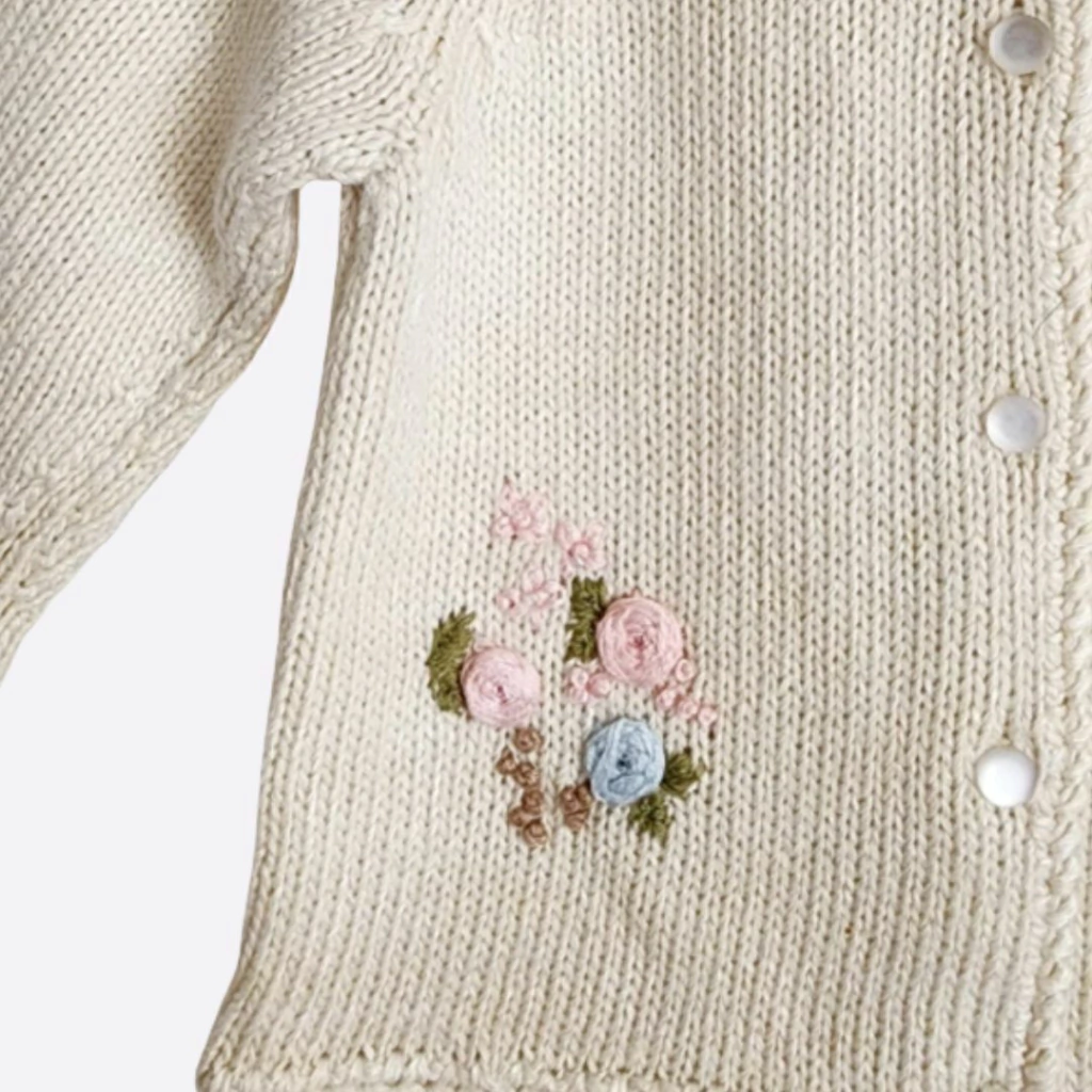 Nuestro Cárdigan esta tejido con hilo de algodón de excelente calidad y bordado a mano uno a uno por nosotras mismas teneniendo cuidado en cada detalle