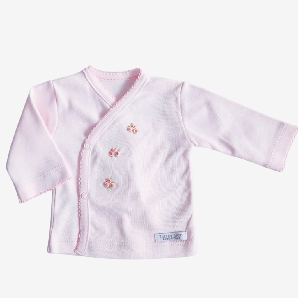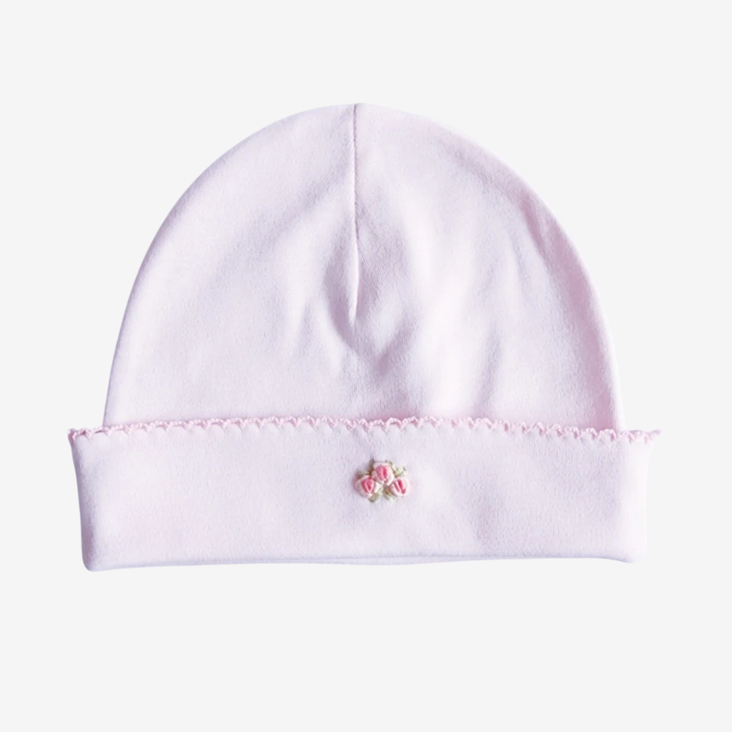 Acompañando al cardigan, la batita confeccionada en algodón pima presenta un bordado que armoniza a la perfección con el resto del conjunto. La ranita y el gorro, también elaborados en algodón pima y con bordados artesanales, completan este look adorable.