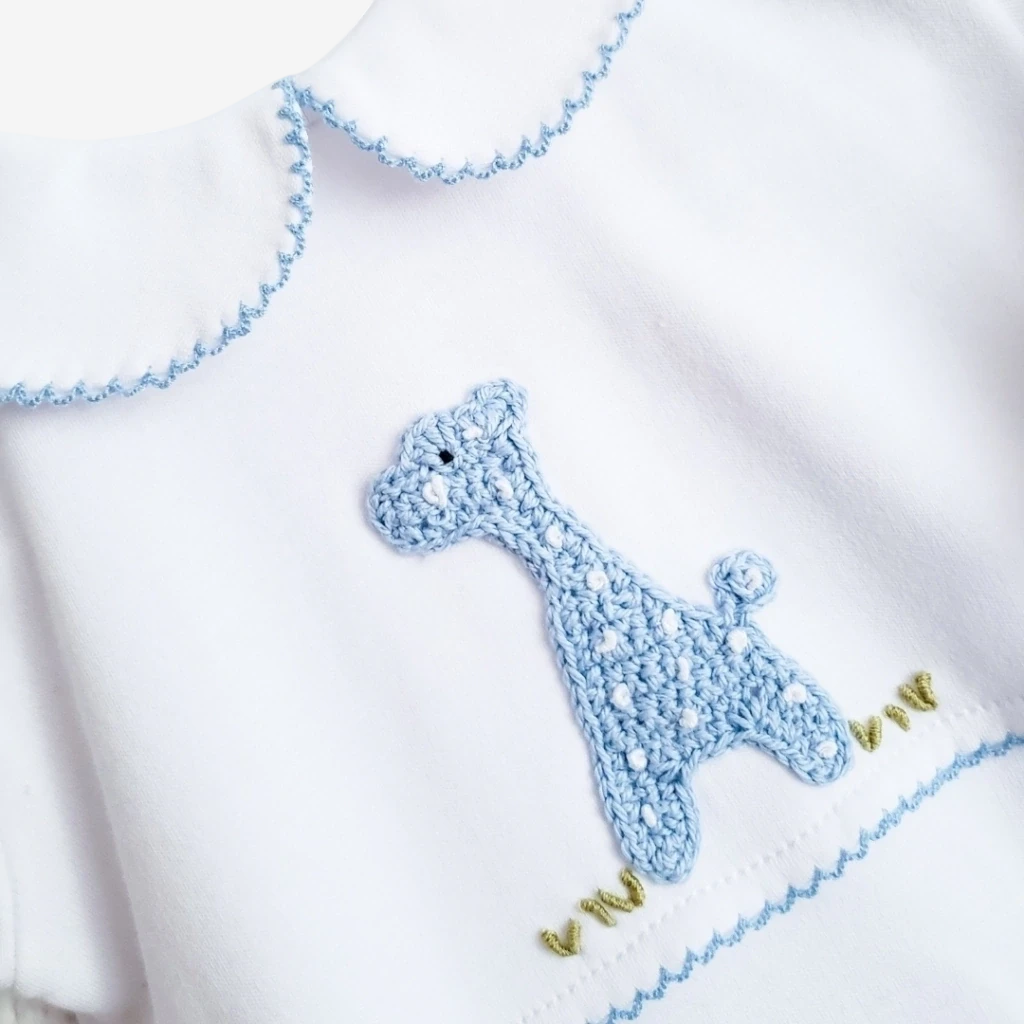 Conjunto compuesto por 1 enterito confeccionado en algodón pima con bordado Jirafa y terminaciones en picot, Un cárdigan tejido con lana antialergica super suave y delicada bordado a mano.