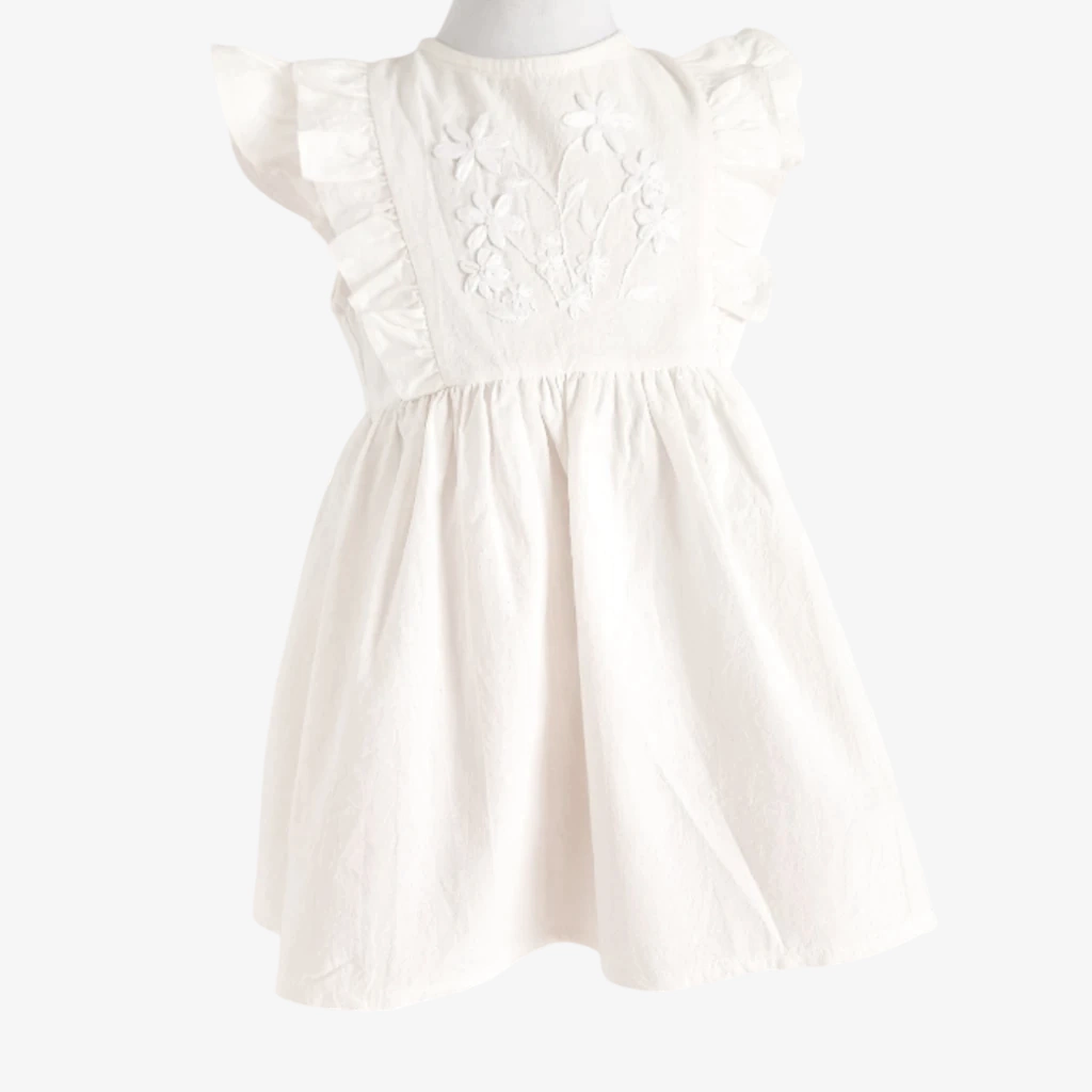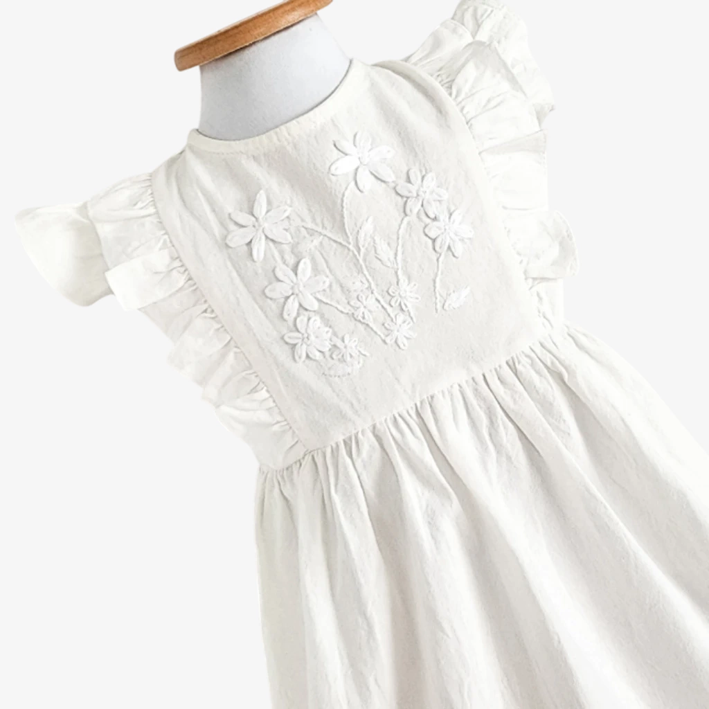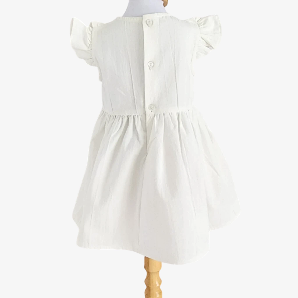 Vestido que conbina delicadeza artesanal y frescura natural.Confeccionado en tusor 100% algodón, una tela liviana y respirable ideal para pieles sencibles, esta pensada para acompañar a tu pequeña con comodidad en cada movimiento.